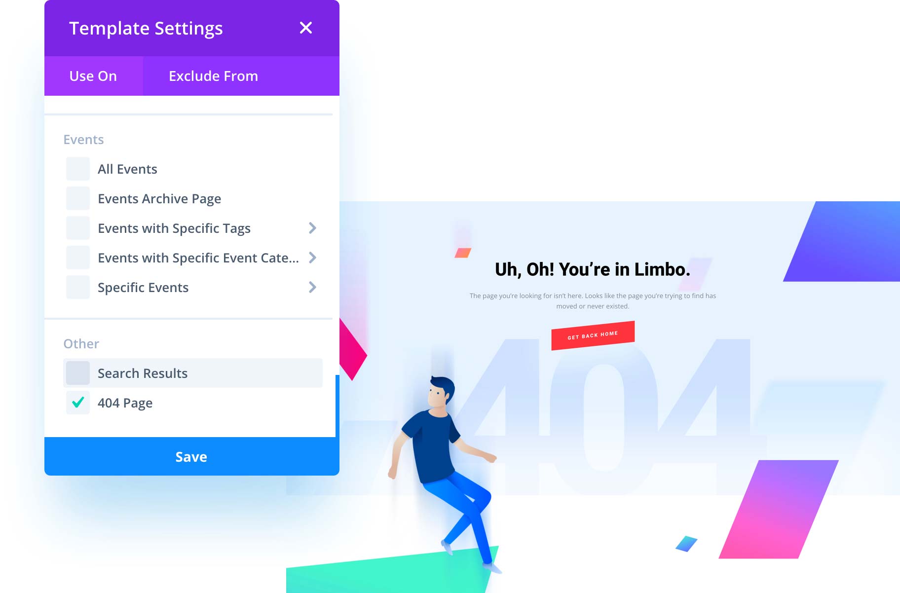 You can do more than just create category templates and post templates with the Theme Builder. You can create custom templates for absolutely anything. Search results, archives, tags, homepages, 404 pages and more. Using conditional logic, multiple parts of your website can be both included or excluded from each Theme Builder template. You have complete control. The beauty of the Theme Builder is that you aren’t restricted to using the Divi Theme’s basic structure but instead can create that structure yourself. Check out some custom 404 page templates we created to give you some inspiration!