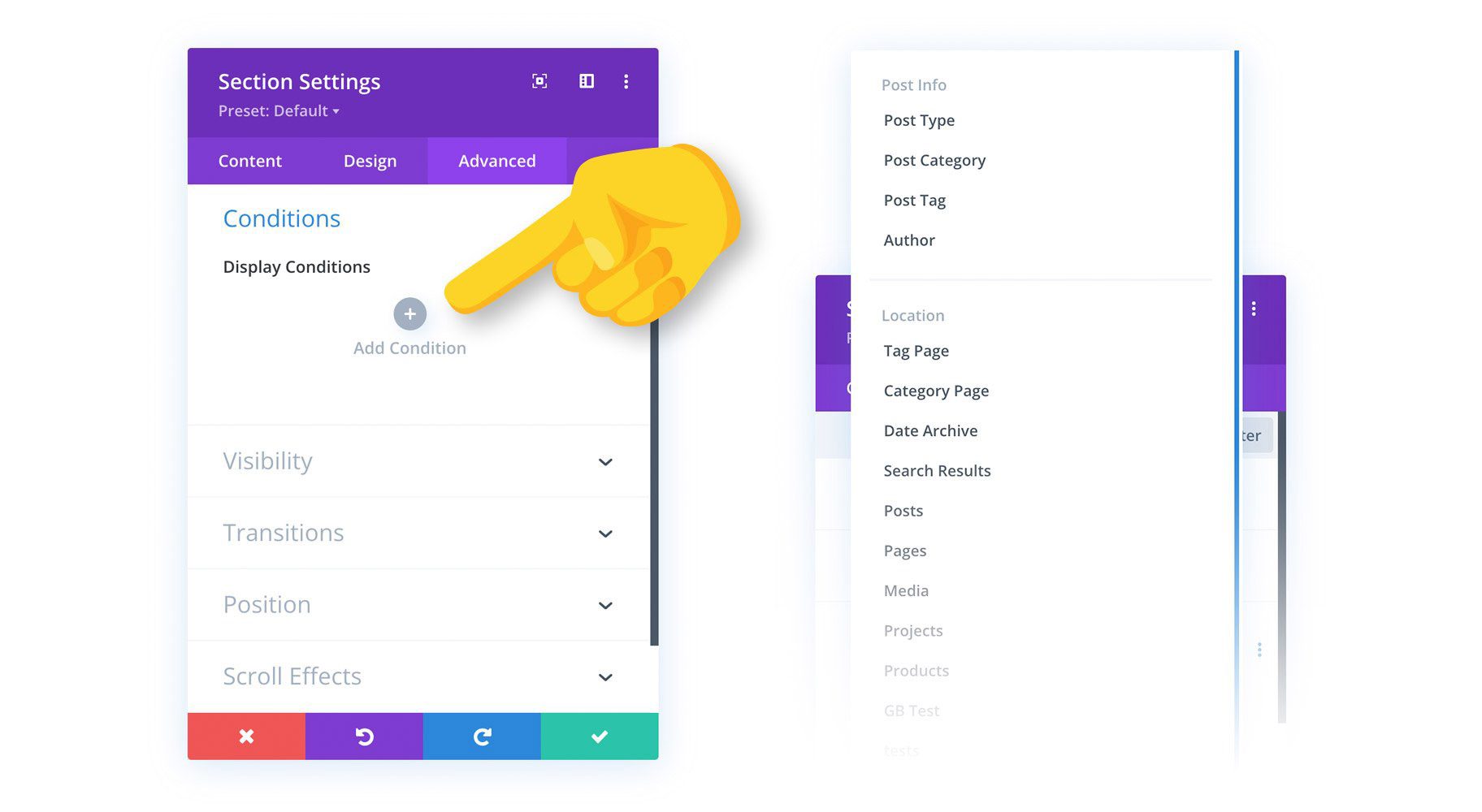 You will notice a new Conditions option group in the Advanced tab of the Divi settings pop-up. Here, you can add new conditions that will control an elementβs visibility. If your conditions are met, the element will be displayed for your visitors. If not, it will remain hidden. You can add multiple conditions too create advanced rulesets, and you can choose to display the element based on whether all or one of your conditions are met.