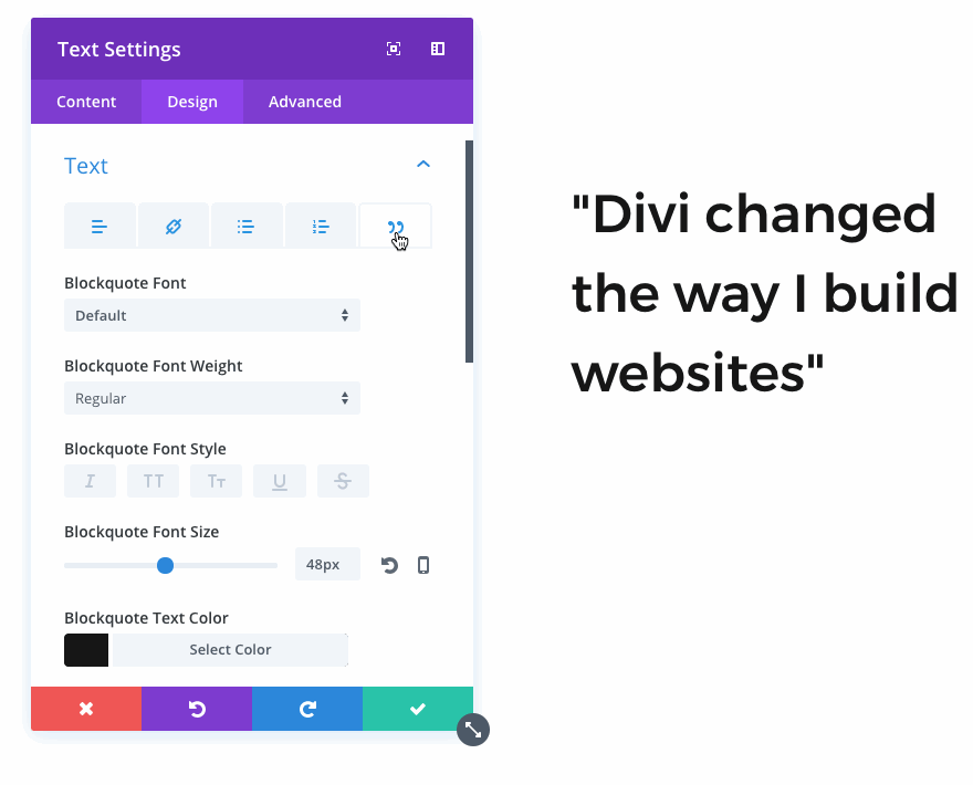 You can now customize your blockquote styles in the Divi text module. Change the font, font style, text size, color and more. You can even adjust the blockquote’s default border weight and color.