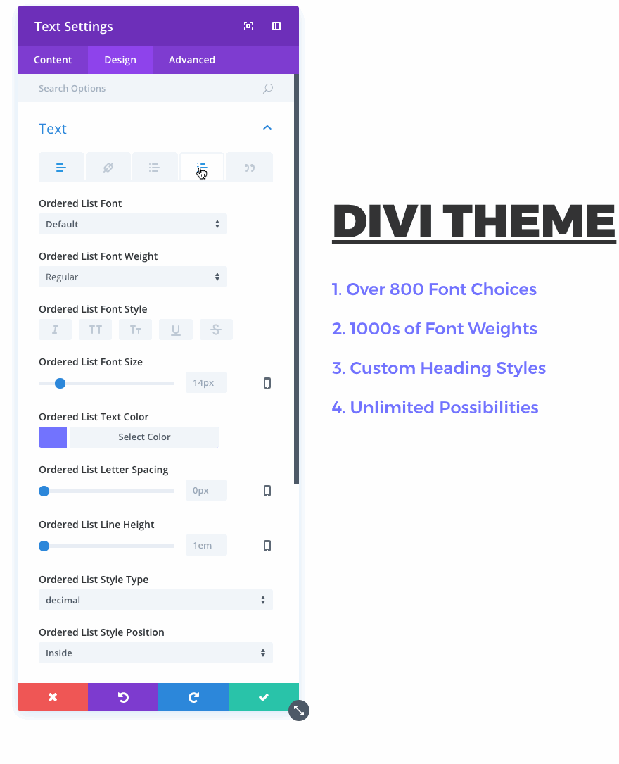 You can now customize your list styles in the Divi text module. Change the font, font style, text size and color. Customize the list style type, position and indentation.