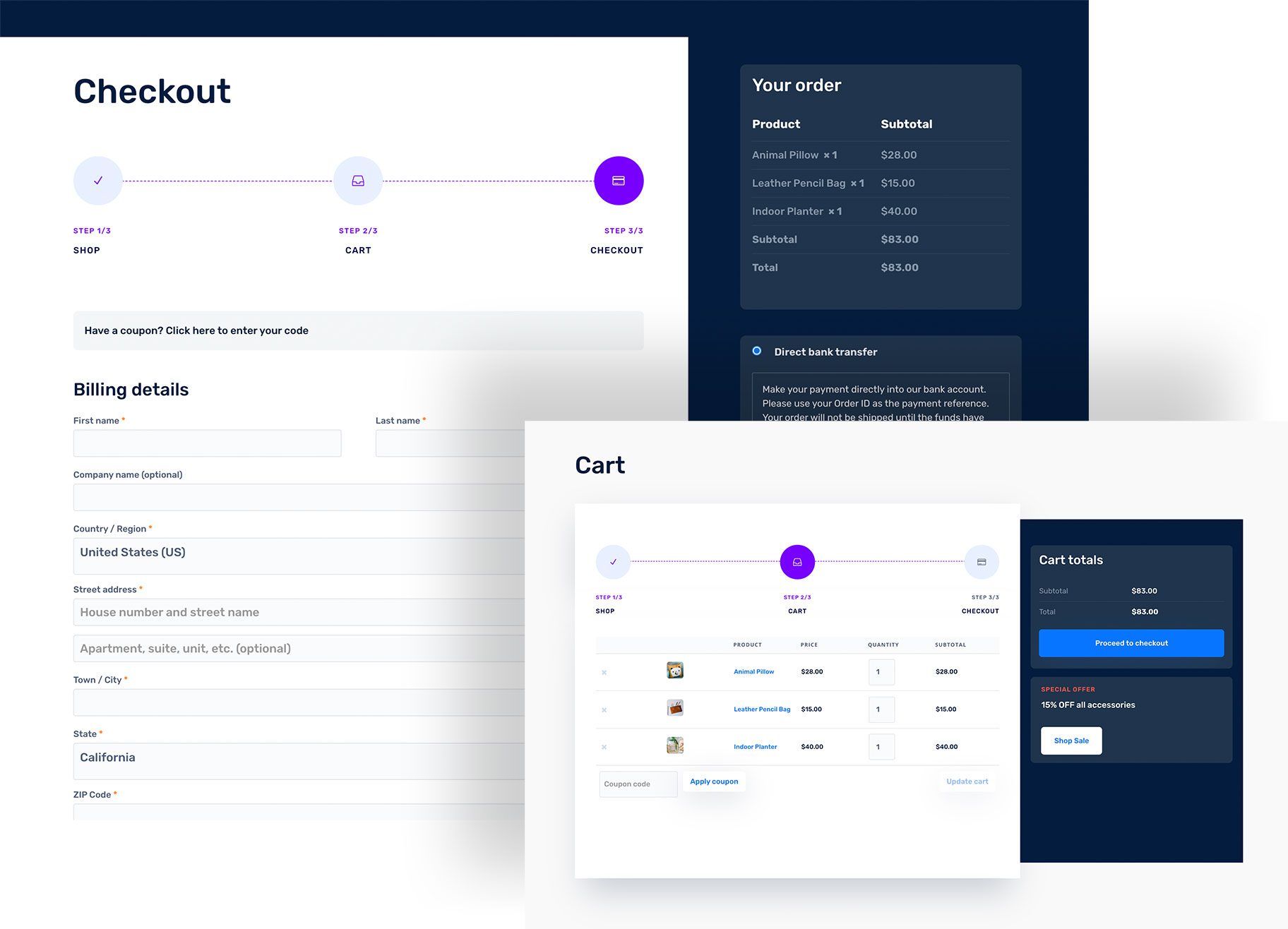 Gone are the days of boring cart tables and bland checkout pages. Now you have complete freedom to unleash your design talent on WooCommerce. Just take a look at some of the beautiful cart and checkout pages that our design team created using this new feature.