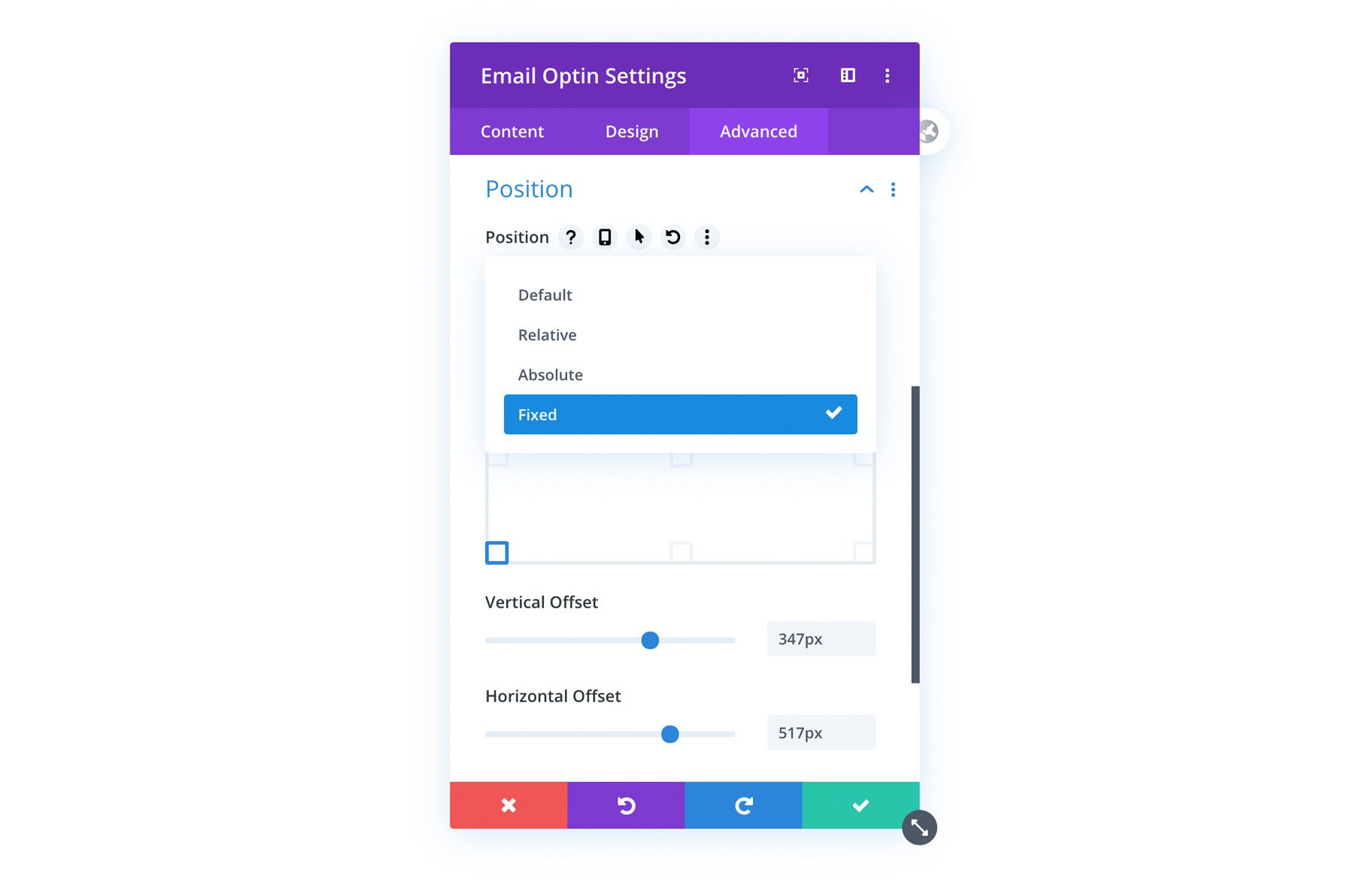 When you change an element’s position to Relative, Absolute or Fixed, a new draggable anchor will appear when you hover over the element. This allows you to drag modules, rows and sections right on the page to change their position. As you reposition the element, its X and Y Offset is adjusted within the module settings. As with all Divi settings, the X and Y Offset controls can be adjusted on desktop, tablet and smartphone independently, allowing you to use position options to create responsive designs.